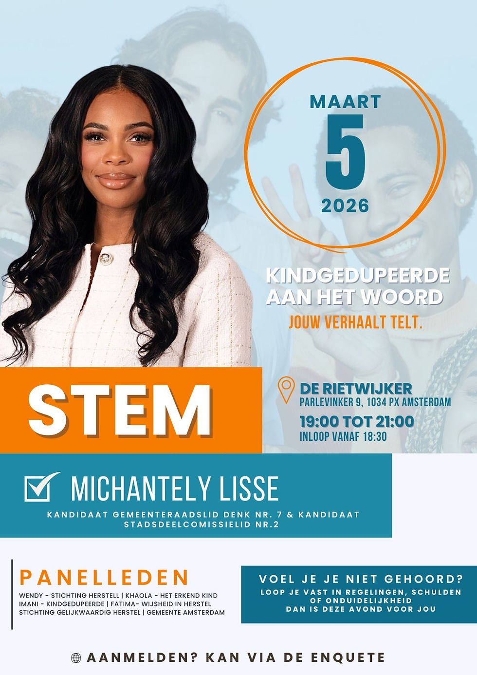 ,knlEen interactieve dialoogavond waarin kindgedupeerden hun verhaal kunnen delen, vragen kunnen stellen en in gesprek gaan met steungroepen, Gemeente Amsterdam en betrokken organisaties. Daarnaast ontvang je ook informatie waar je nu recht op heb en bij welke organisatie je daarvoor moet zijn. -Een avond voor erkenning. -Een avond voor duidelijkheid. -Een avond waarin jouw stem centraal staat. Programma in het kort * Interactief panelgesprek met steungroepen & Gemeente Amsterdam * Ruimte voor vragen en persoonlijke verhalen * Informatie over rechten, regelingen en brede ondersteuning * Signalen en oplossingen richting de politiek 📅 Donderdag 5 maart 🕡 Inloop 18:30 🕖 Start 19:00 – 21:00 📍 De Rietwijker, Parlevinker 9, Amsterdam-Noord 👉 Aanmelden & info: https://forms.gle/9yu5e5EpfzRSC9cCA Ken je kindgedupeerden in je netwerk? Deel dit bericht. Stuur de link door. Samen zorgen we dat onze stem wordt gehoord.